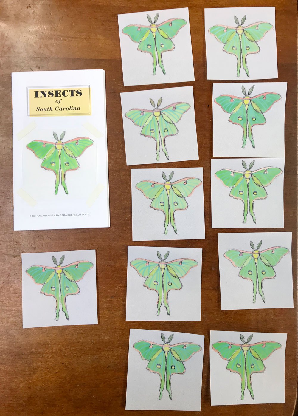 On the cover, I taped a laser print of a sketch of a Luna Moth. The sketch is printed on velum. I then painted each print with gouache – to make them a bit more special.